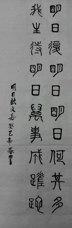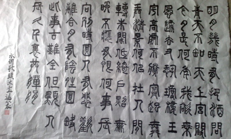 到了读初中的那会儿,国庆的时候学校举行了“国庆书画展”比赛,虽然我也参加了,但不是书画作品,是一个易拉罐浮雕来着(这个以后另外介绍),但这个不是重点,重点是比赛的作品令我深深震撼了,其中的字、画和篆刻实在是太美了(实在想不出其它词来形容T_T),换做是我肯定写不出来。于是我便开始学习毛笔书法,但是遗憾的是没有按正确的方法练习,自己一个人瞎捣鼓,提升也不大。后来又因为去海丰读高中,3年时间没碰过毛笔,直到去了所谓的“大学”,加入书法协会后才进行正规的训练。