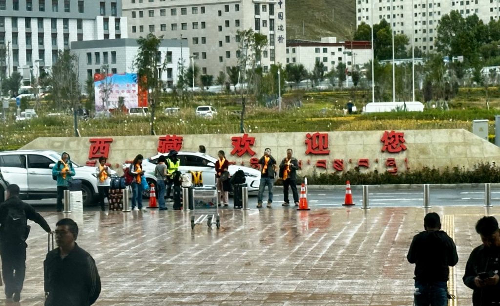 到达贡嘎机场的时候,已经是下午三点半了。从机场出来,天灰蒙蒙的,下着毛毛细雨,风一阵一阵地刮着,给人一丝寒意。当时我还穿着短袖,不得不拿上一件外套披上。