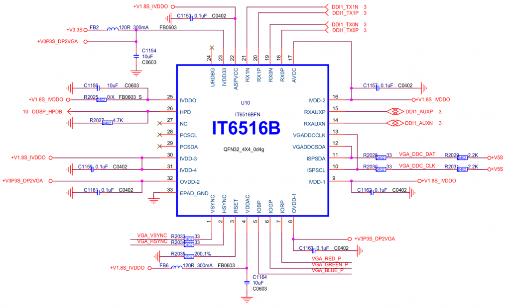 那要设计一个VGA接口的线路又是怎样的呢?DDI出来的信号是DP或HDMI,要变成VGA信号则需要经过转换,转换的芯片很多,下图是使用IT6516B将DP转为VGA的线路: