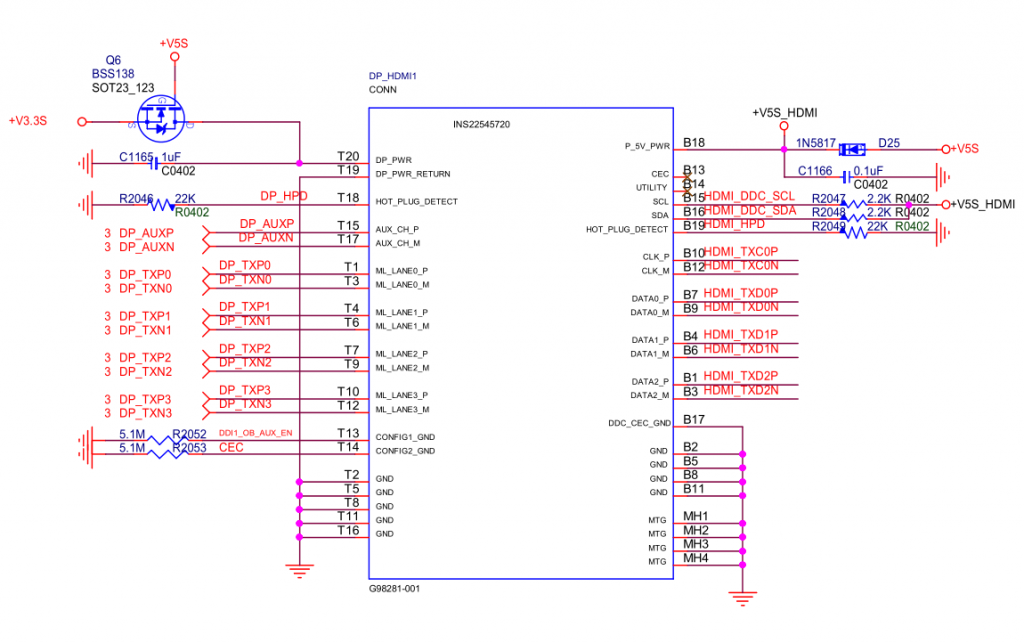 若设计成HDMI接口,需要把DP中用到的AUX换成DDC(Digital Display Channel),也可以说是一组I2C信号,它是由PCH出来的,作用与AUX也是类似,用于与屏幕之间的数据通信,如获取屏幕EDID数据,屏幕亮度控制等。下图是一个DP和HDMI一体的接口,展示了两种信号的设计方案。