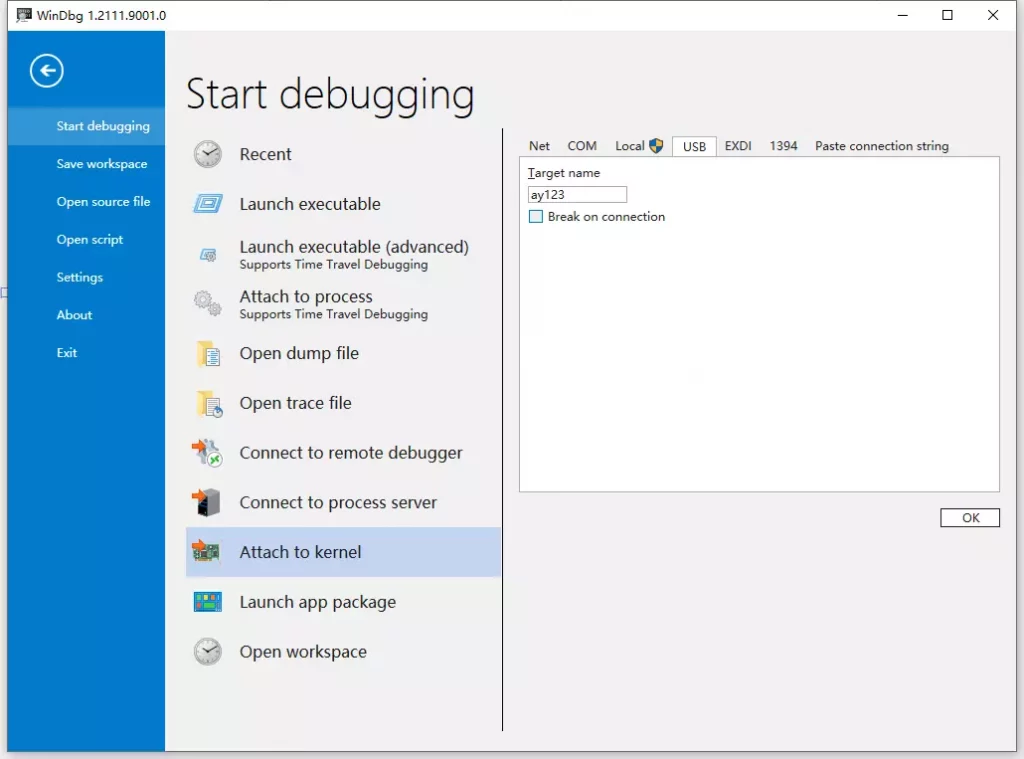 3.windbg依次打开File - start debugging - Attach to kernel,切换到USB选项卡,Target Name输入之前在目标机器打开调试模式时的USB目标名,则然后点击OK。