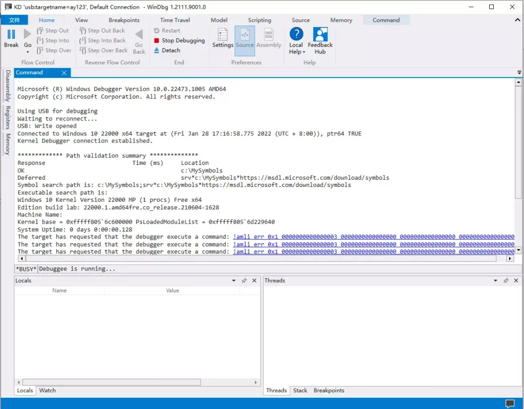 首次进行WinDbg DEBUG时需要联网下载pdb文件,需要等待一段时间。正常连接后如下所示: