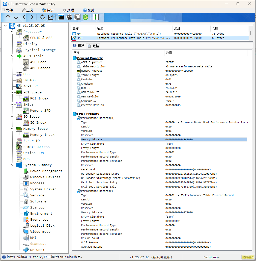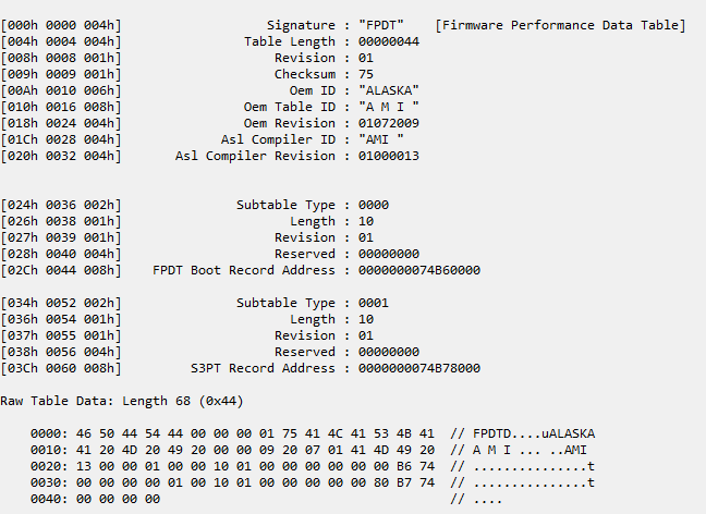 知晓原理之后,便可以使用工具读取FPDT ACPI Table 验证,下面是使用HE读取的结果。