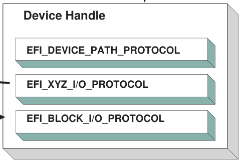 一个句柄上可以安装多个协议,用以表示该组件所具备的多种能力。例如,一个代表SATA控制器的句柄上,可能同时安装了EFI_DEVICE_PATH_PROTOCOL(描述其在系统中的位置)和EFI_BLOCK_IO_PROTOCOL(提供块读写能力)。