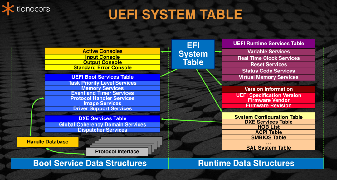 - 事件和服务存根 (Event and Service Stubs): 在早期初始化事件通知系统和服务表。特别是,它会为每个DXE架构协议创建一个通知事件。当某个架构协议被安装时,相应的事件被触发,DXE Foundation的回调函数就会执行,以完成依赖该协议的各项服务的最终初始化。