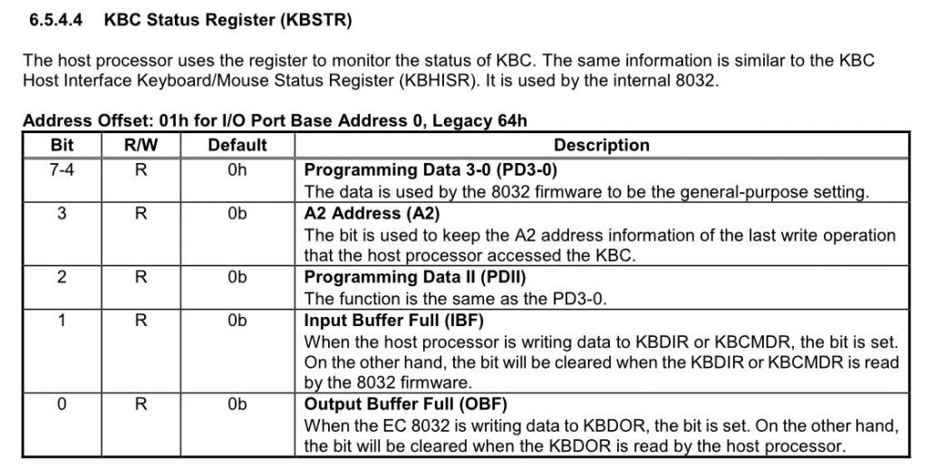 当Host往60h或64h写数据时,KBSTR中的IBF bit 置1,如是写60h,A2 bit清0,写64h,A2 bit置1。EC 8032可根据IBF bit(KBHISR)是否置1或检测是否有INT24中断(前提是中断功能有启用)来判断是否有数据输入。当EC 8032从KBHIDIR读走数据时,IBF bit会被清0。
