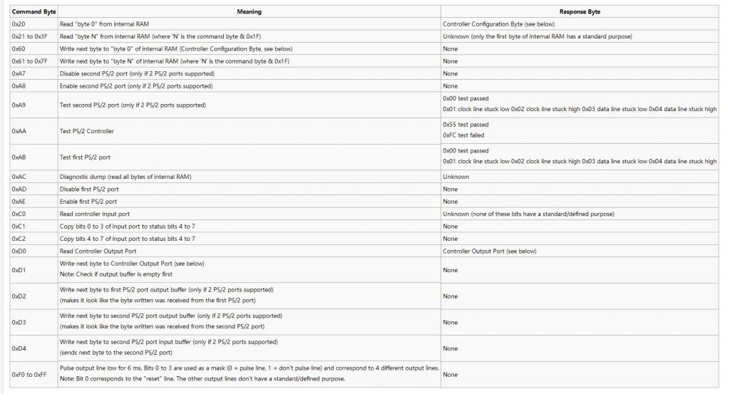 KBC 设备支持很多种Command,一个command一般为一个byte,有的command还有接参数。Host发完一个command,EC一般都会有一个响应值,响应一个ACK或直接返回原来的command,表示发送的命令出错。下面列出所定义的Command,但并不是所有的KBC设备都会全部支持。