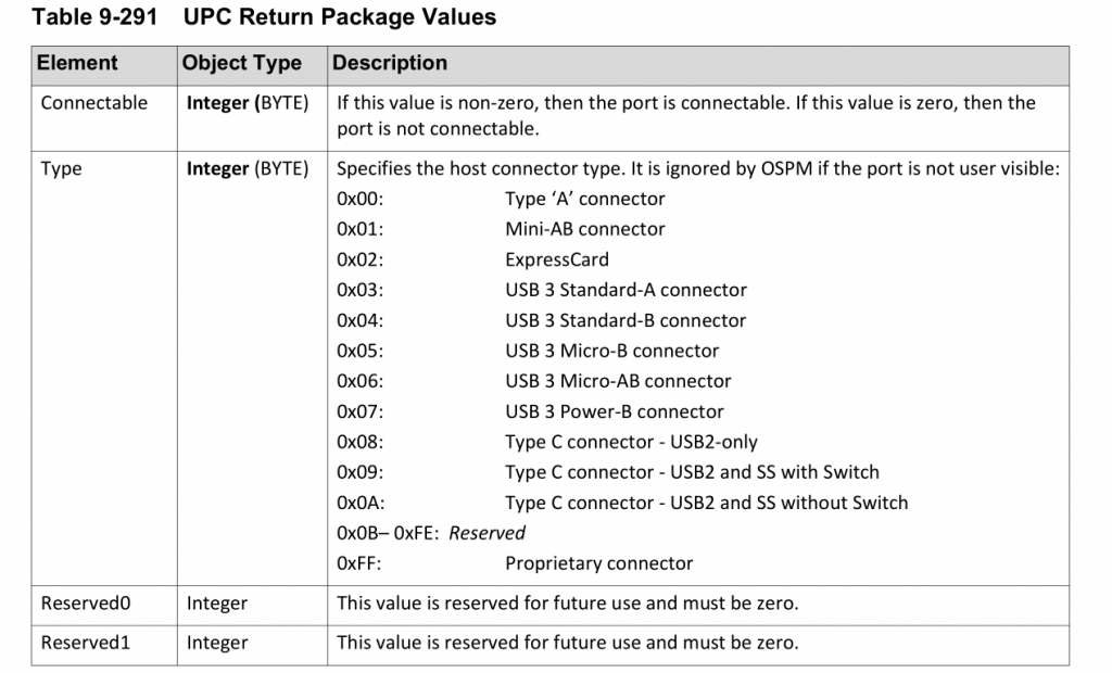 此可选对象是一种允许平台与操作系统进行通信的方法,其中某些USB端口功能是当前USB主机总线适配器规范(例如UHCI,OHCI和EHCI)未提供的。 如果由平台实现,则此对象将出现在给定USB主机总线适配器上的每个USB端口(子端口); 操作系统软件可以在引导时检查这些特性,以获取有关系统USB拓扑,可用USB端口等的信息。此方法适用于USB根集线器端口以及通过集成USB集线器实现的端口。
