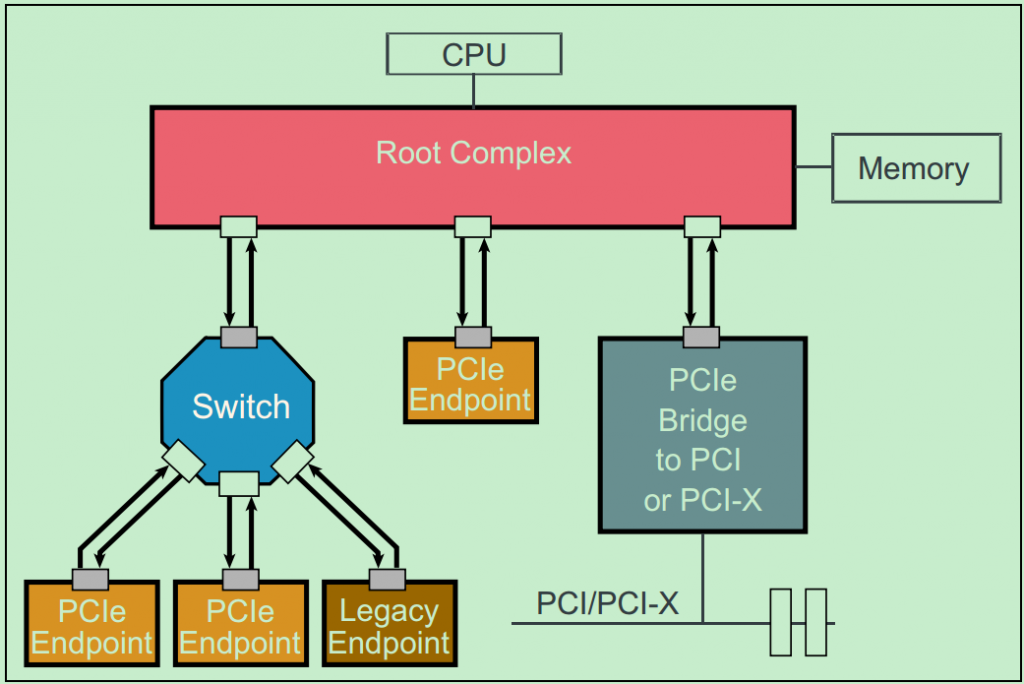 PCIe是一种点对点连接的总线,而不像PCI那样的共享总线。但PCIe总线系统可以通过Switch连接多个PCIe设备,也可以通过PCIe桥连接传统的PCI和PCI-X设备。一个简单的PCIe总线系统的拓扑结构图如上所示。