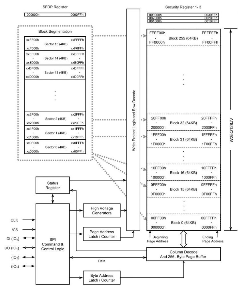 从规格书中可知道,该ROM大小为128Mb(16MB),由65536个Page组成,其中,每个Page大小为256 byte,每16个Page组成一个Sector(4KB),每16个Sector组成一个Block(64KB)。要注意一下的是,每个厂商的Flash可能对这些概念的定义有所差异,需以实际为准。