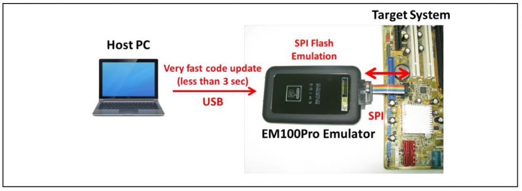 仿真器可以模拟出指定某种SPI ROM型号,然后可以将固件快速“写入”其中,此时仿真器相当于一个SPI ROM,只需将仿真器的排线接到主板的仿真器接口(有些大厂在设计主板时,除了预留烧录接口,还会预留仿真接口),便可以进行调试。