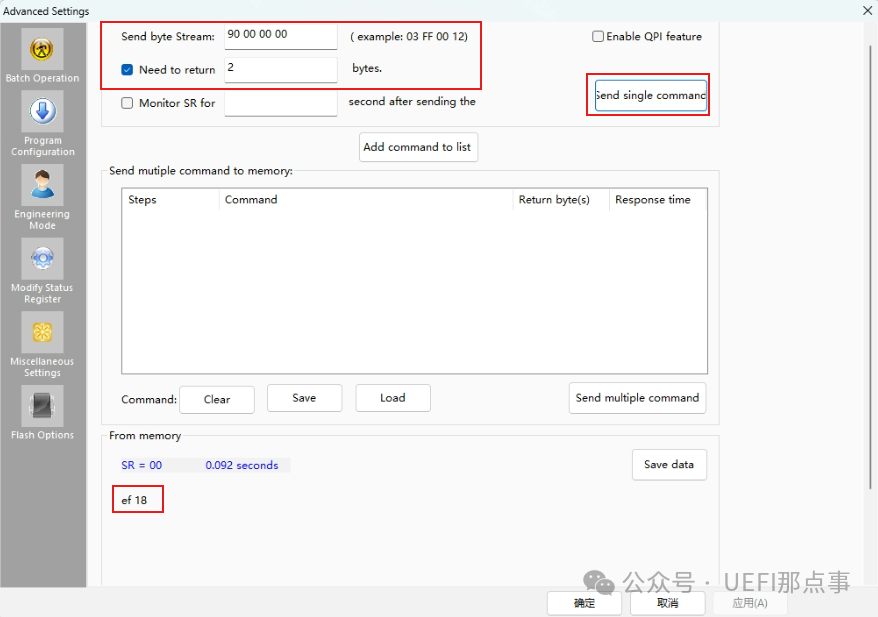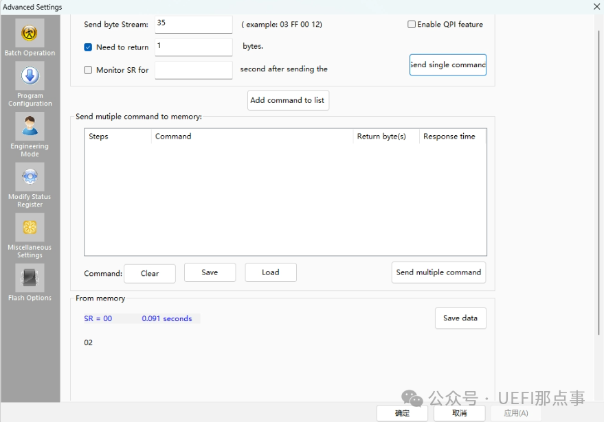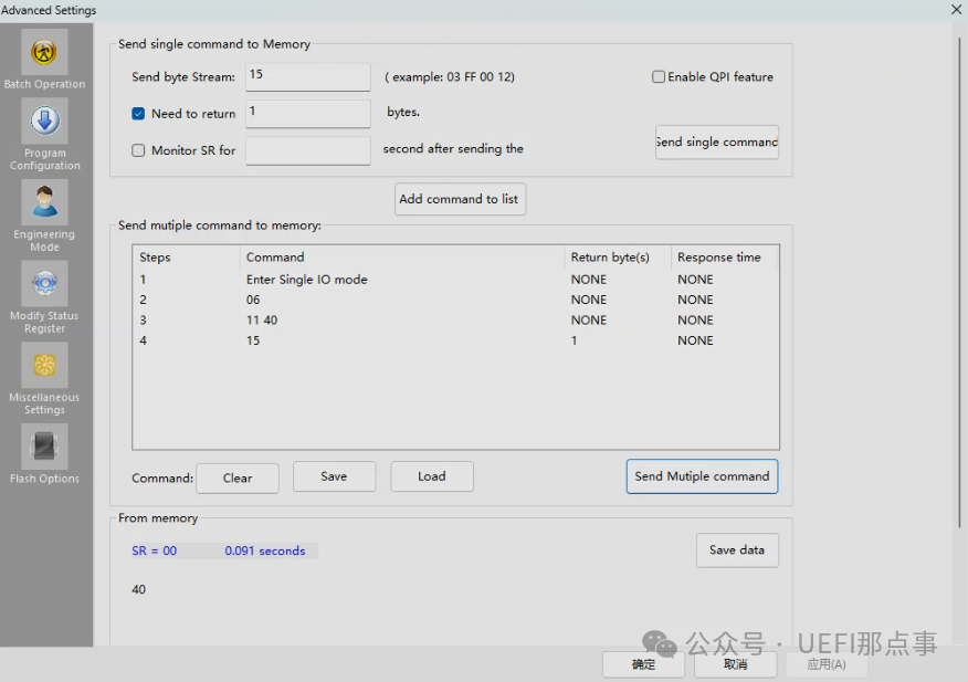 使用 15h 指令读取该寄存器,值为 20,对应上图中的 75%。为了演示写操作,将其设置为 50%,即写入 40。此操作需要写寄存器,写前需要06指令启用可写模式,然后再发送写寄存器指令,最后读取写后的值。这一系列的操作可以利用 Dediprog 的命令列表,先逐个添加指令,然后执行指令,如下: