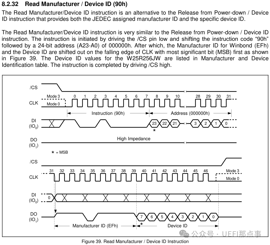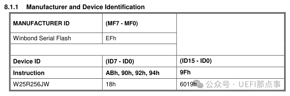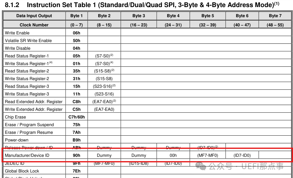 查看 Flash 手册的 Instruction Set Table 1,并跳转至详细定义,可知,指令是 90h,指令后需要接 24 bit 值为 0 的地址,最后返回两个字节的数据。