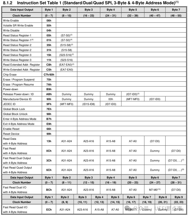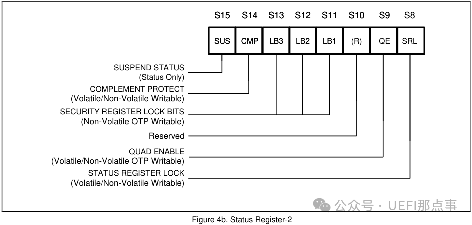 这三个寄存器中,对我们稍微有联系的是状态寄存器 2 中的 Quad Enable 位,简称 QE。在生产过程中,有些烧录器会擦除该 bit,便可能出现主板不开机的现象。