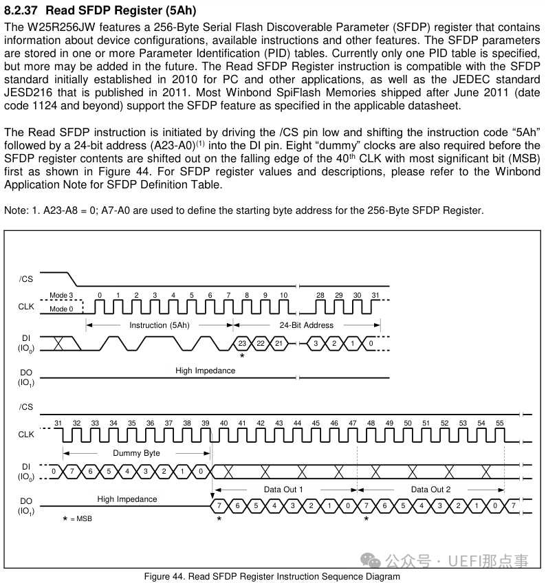 读取 SFDP 的指令是 5Ah,需要接 24 bit 地址和一个 dummy byte,使用 0 填充即可,返回数据共 256 byte。