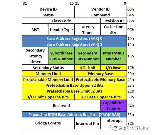PCI桥在PCI设备树中起到呈上起下的作用。一个PCI-to-PCI桥它的配置空间如下: