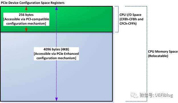 PCIe规范在PCI规范的基础上,将配置空间扩展到4KB。原来的CF8/CFC方法仍然可以访问所有PCIe设备配置空间的头255B,但是该方法访问不了剩下的(4K-255)配置空间。怎么办呢?Intel提供了另外一种PCIe配置空间访问方法:通过将配置空间映射到Memory map IO(MMIO)空间,对PCIe配置空间可以像对内存一样进行读写访问了。如图