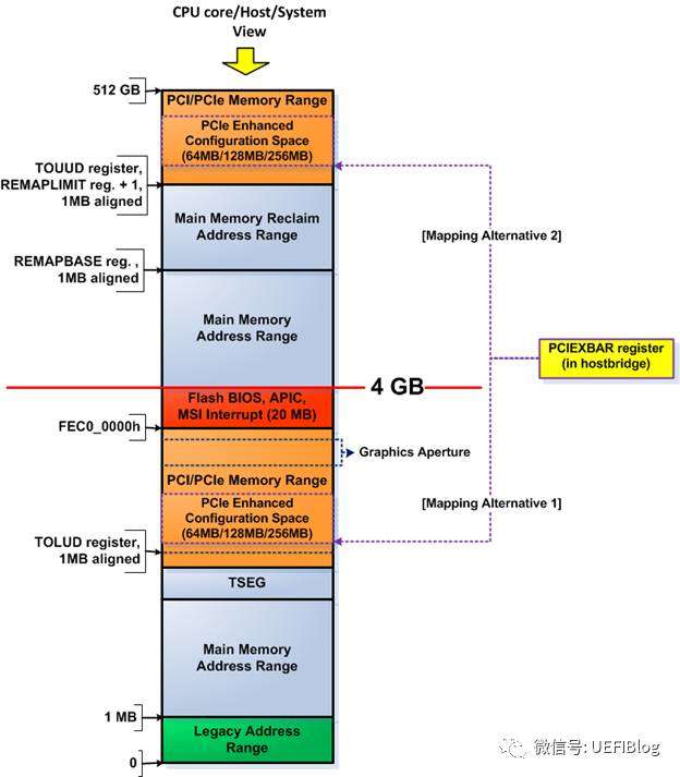 其中PCIEXBAR就是这个MMIO的起始位置,在4G下面占据64MB/128MB/256MB空间(4G以上部分不在本文范围内,我们今后会详细介绍固件中的内存布局),其具体位置可以由平台进行设置,设置寄存器一般在Root complex(下文简称RC)中。