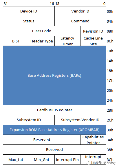 现在我们来看看在配置空间里具体有些什么。我们以一个一般的type 0(非Bridge)设备为例: