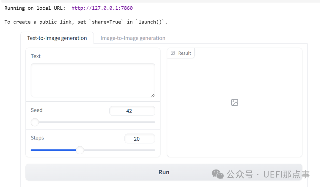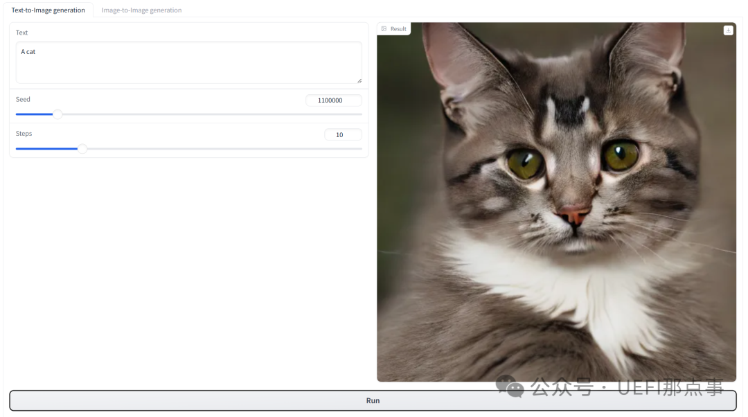 成功之后,你会在页面底下看到几个输入框界面,此时便可以在Text处输入提示词了,如 A Cat,大概十几秒便可生成一张图片。也可以点击本地的链接,可以单独打开一个页面。这个模型看起来不支持中文,如果用中文提示词,图是胡乱生成的。