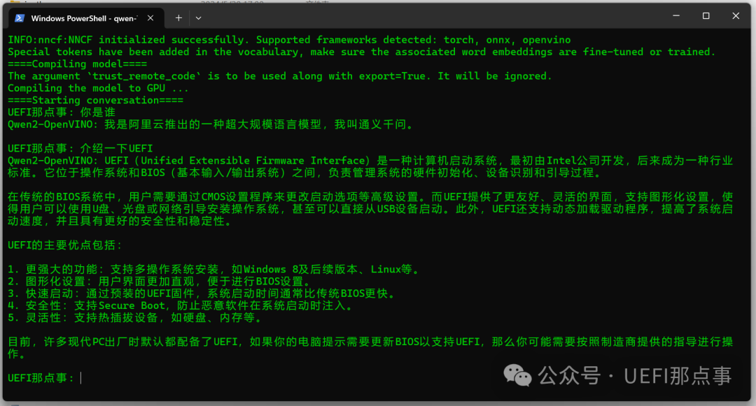 openvino_notebooks这个项目提供了非常多的例子,其中有一个llm-chatbot,支持大部分开源的大语言模型。国外的模型尽管可以支持中文,但是聊着聊着会变成英文,也有中英混合的情况,所以最好选择阿里的Qwen项目,对中文的支持比较完善。Qwen分为几个版本,我选择的是参数量比较大的qwen-1.5-7B版本,但是部署这个一直没有成功,后面去github找了一下,发现有个项目有相关脚本和教程,地址:https://github.com/OpenVINO-dev-contest/Qwen2.openvino/blob/main/README_zh.md。