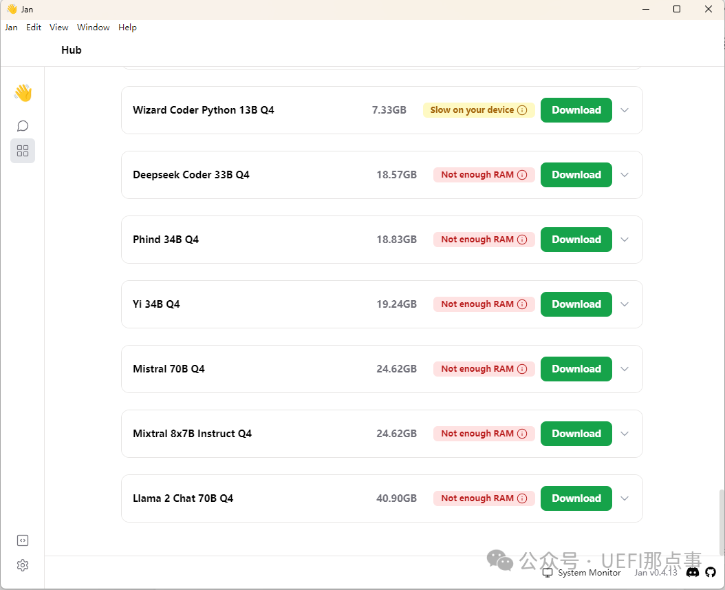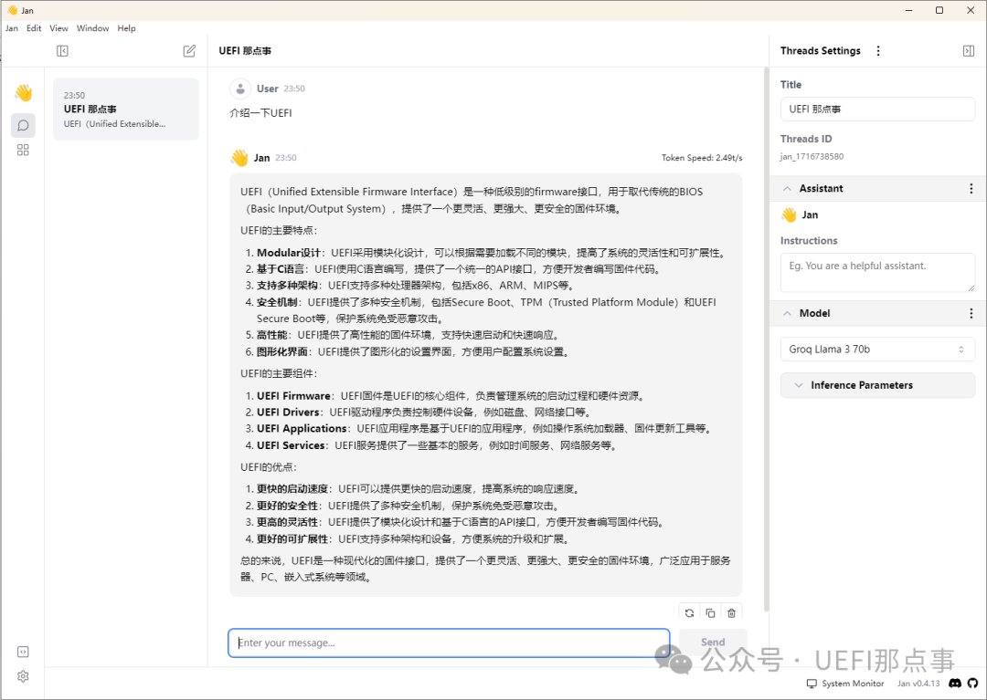 整个部署的过程还是非常简单的,照着文档写的步骤很容易搭建成功,最大的障碍其实是网络问题。如果有NV的显卡,可以直接使用开源项目Jan(https://github.com/janhq/jan)提供的Chat客户端,一键下载部署,非常方便。