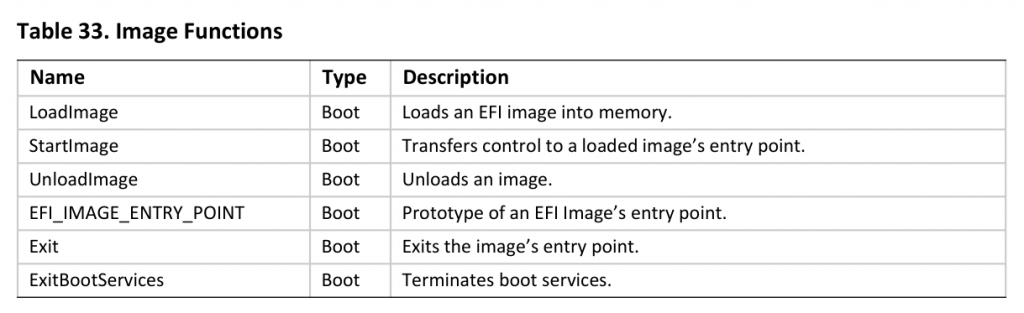 不管是EFI Driver,还是EFI APP,它们都统称为EFI Image。UEFI 中定义了 EFI Image 的操作方法及其标准,即Image Services,如下: