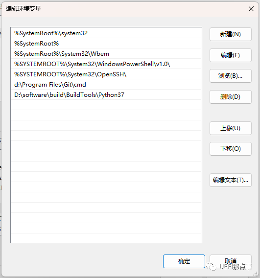 在操作系统中,环境变量可以用来指定可执行程序的路径,系统在调用程序的时候,会在环境变量中执行指定的程序。如编译EDK2代码用到的工具Python,如果要让系统可以调用,则需要在系统环境变量中,添加安装路径。