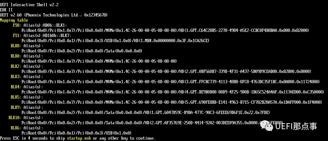 进入Efi Shell的时候,最后有个倒计时提示:Press ESC in xx seconds to skip startup.nsh or any other key to continue.