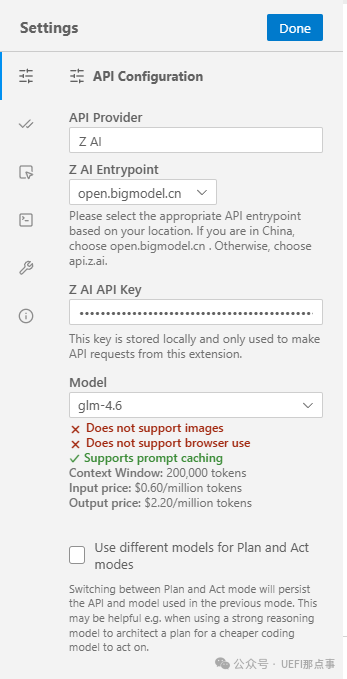 经过测试,目前多数模型对 UEFI 编程这块并不是很好,稍微好一点的是智谱的 GLM-4.6,当然如果有条件,可以使用 claude,GPT-5 codex 等顶级模型,本文示例用的是 GLM-4.6。