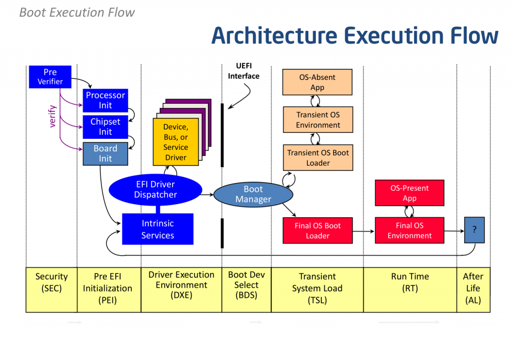 UEFI的启动共有7个阶段,分别是:SEC->PEI->DXE->BDS->TSL->RT->AL,下面以UDK代码的形式记录下整个流程。
