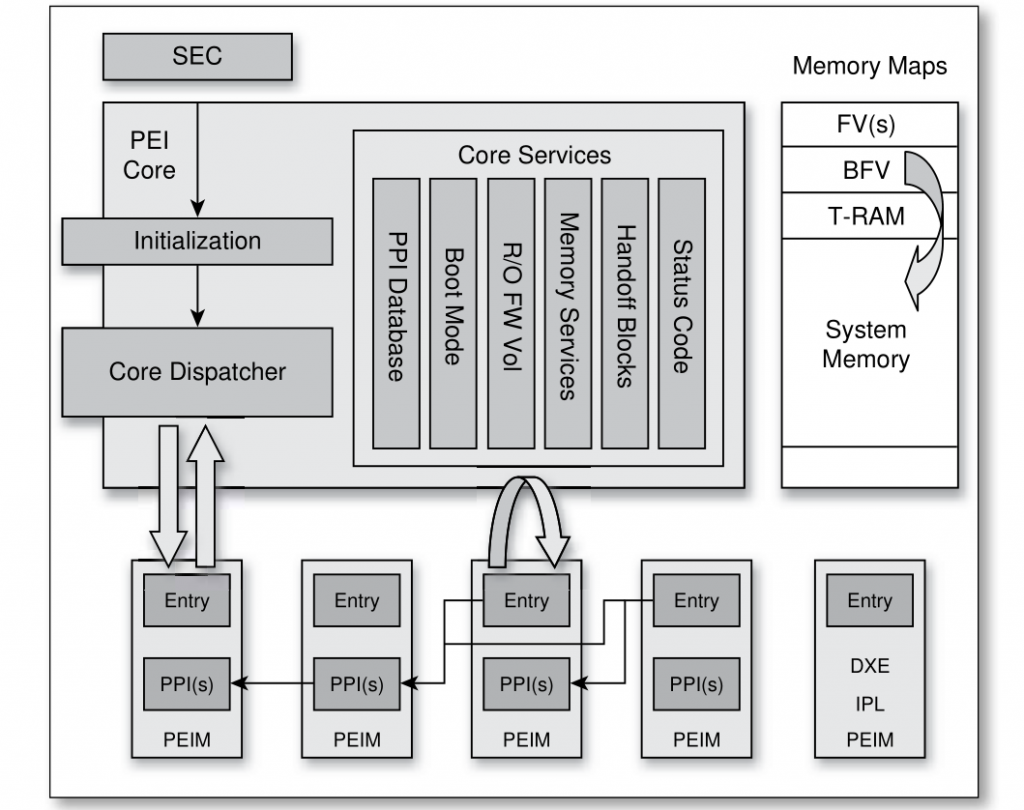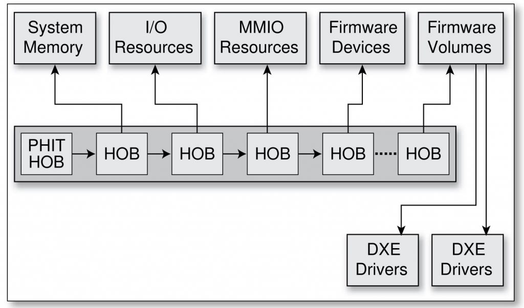 PEIM调度完毕,真正的内存便可以使用了,此时PeiCore会重新调用一次,将初始化的数据从临时内存迁移到新的内存中。接着创建HOB List(HOB,一种内存中的数据存储机制,用来传递PEI阶段信息到DXE阶段),然后再通过一个特殊的PPI (DXE IPL PPI)调用并将HOB List传递给DXE入口,进入下一阶段。