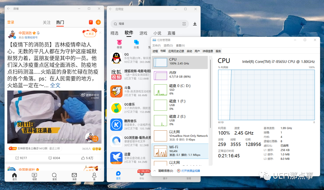 首先是笔记本,i7-8565U + 8.00 GB 的配置,打开一个应用宝跟微博,CPU占用满了,系统操作略卡顿,看起来非常消耗系统资源。
