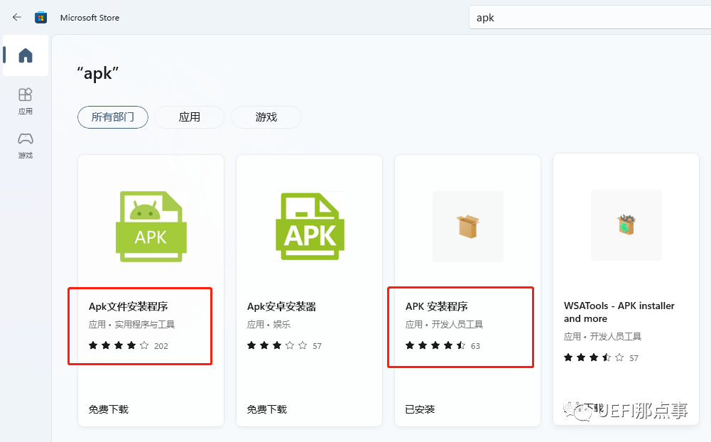 启动Windows应用商店,搜索“APK”,安装如下红框中的一个即可,第二个可以自己选择adb工具,但是貌似兼容性不是很好,我在有的机器上安装后无法正常启动,第二个也可以。