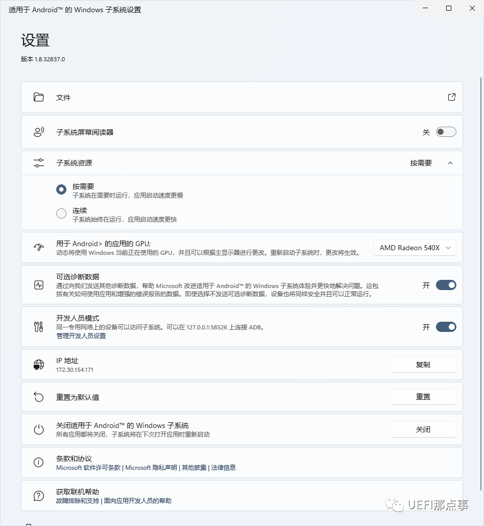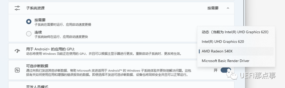子系统资源:默认设置“按需要”,即当要使用WSA的时候要手动启用,不用的时候会自动关闭;而“连续”则是子系统一直在后台运行,不管需不需要,这种情况下启动APP的速度比较快,前者慢一些。