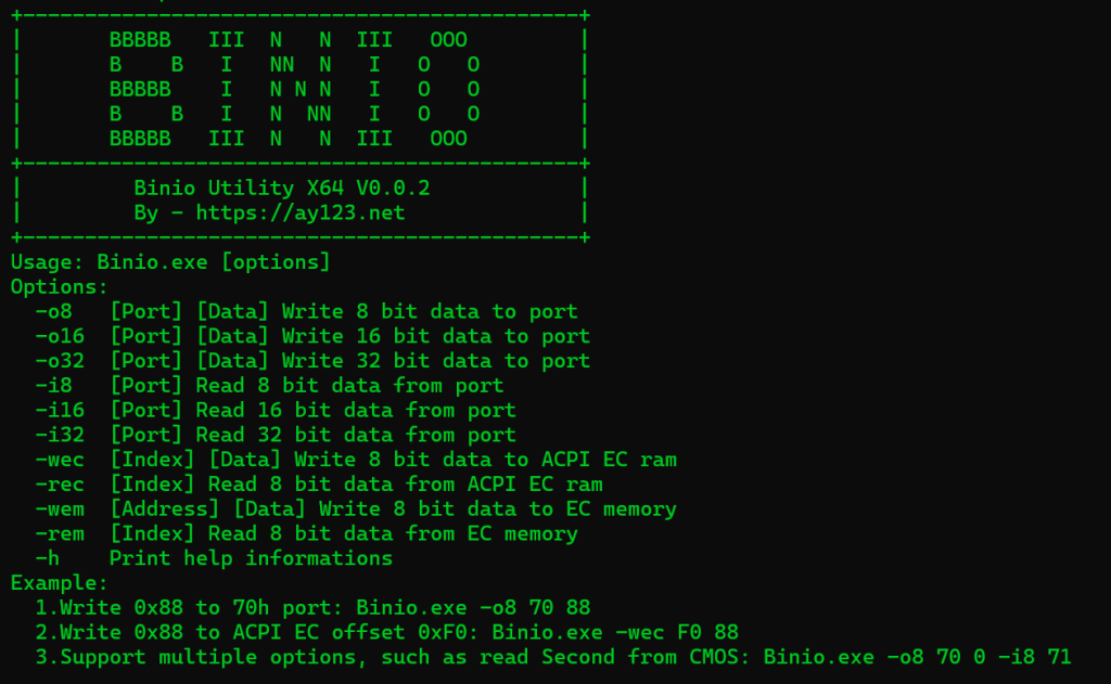 binio 基于 Winring0 的驱动开发,功能比较简单,只实现了对 IO 的读写,包括 ACPI EC 部分空间,如果是 ITE 的 EC,也可以根据地址读写。